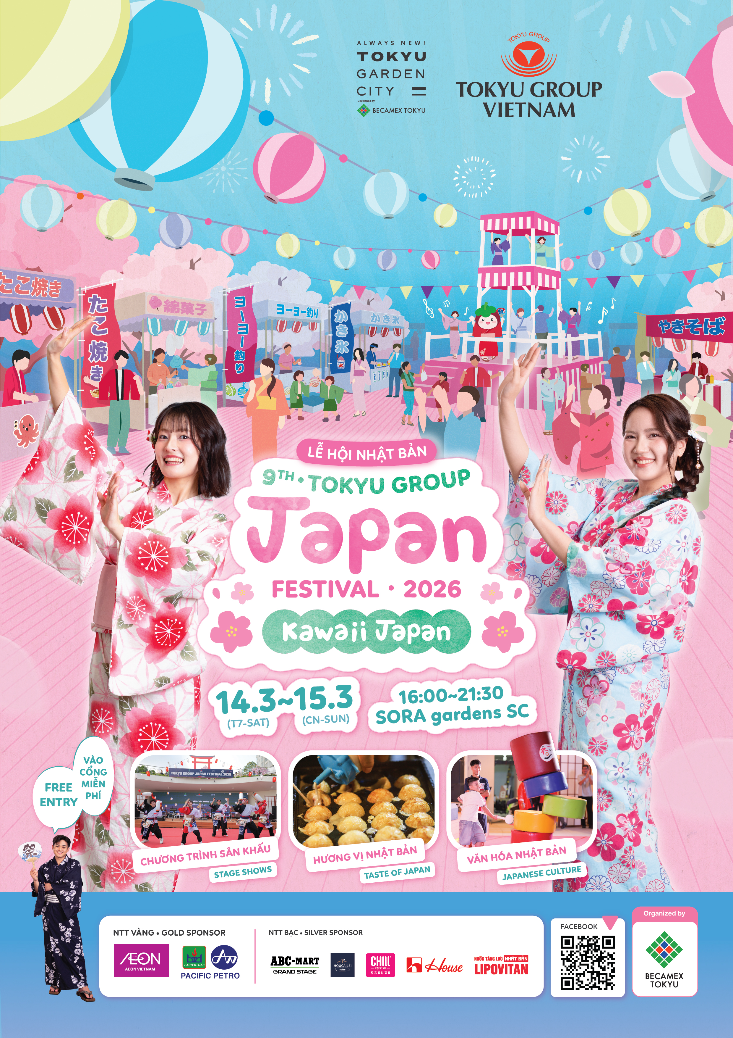 Giữa tháng 3 này, phường Bình Dương, Thành phố Hồ Chí Minh sẽ lại rộn ràng hơn thường lệ khi 9th TOKYU Group Japan Festival 2026 được tổ chức bởi BECAMEX TOKYU và TOKYU GROUP quay trở lại với chủ đề "KAWAII JAPAN", diễn ra trong hai ngày 14 và 15/3/2026 tại TTMS SORA gardens SC.